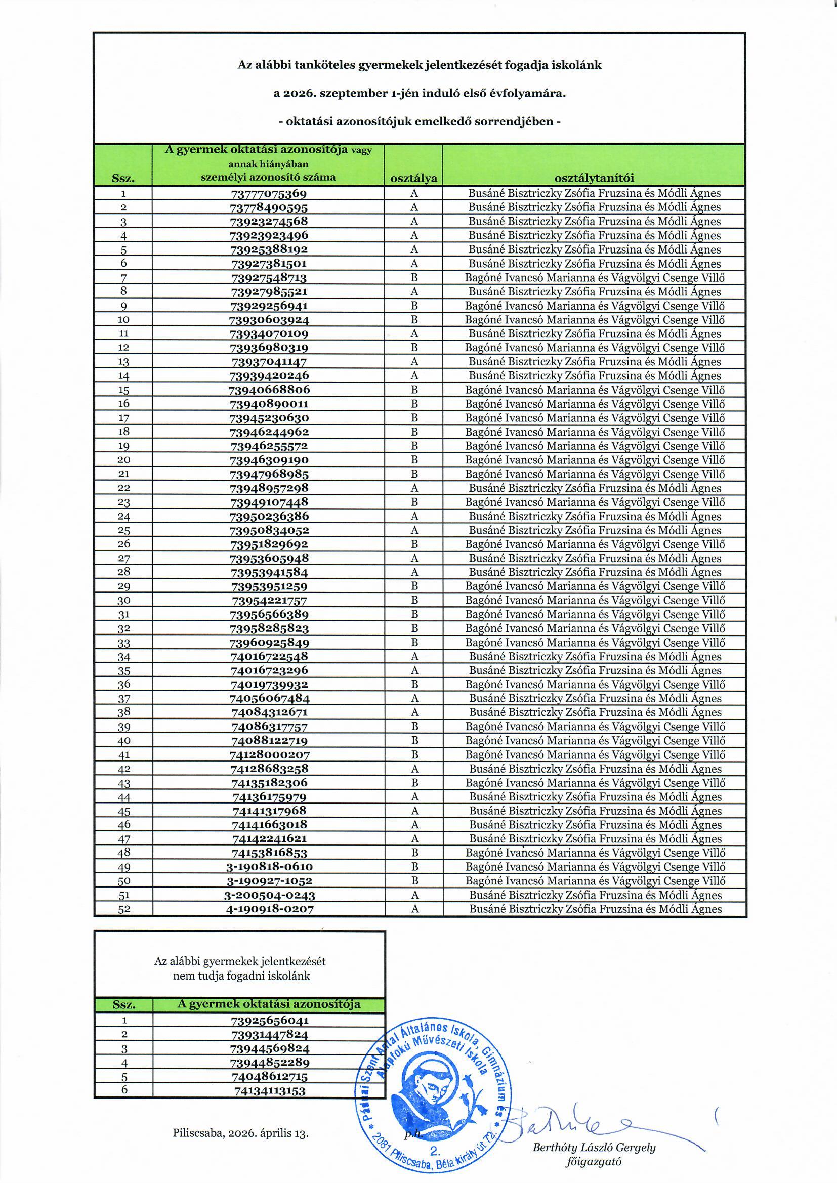 Akik jelentkezését helyhiány miatt nem tudtuk fogadni, azoknak tanköteles gyermeküket 2026. április 23-ig más iskolába kell beíratniuk. A hozzánk beadott jelentkezési dokumentumaikat visszapostázzuk.