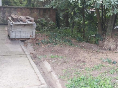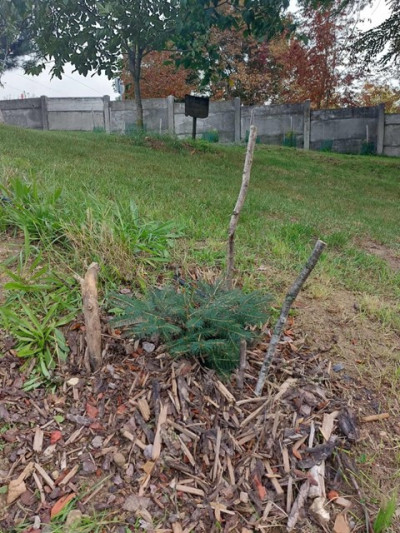 a belső udvarban kinőtt magonc fenyő kimentésére a burkolatból, amit kint elültettünk,