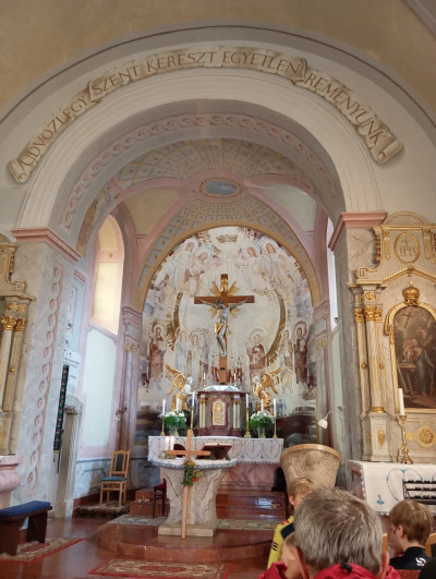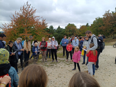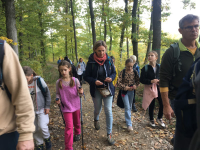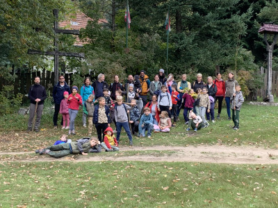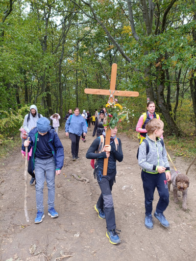 szétváltak útjaink. Elmeséltük, hogy a zarándoklat is egy imaforma, ez az út is és az életünk is végül Istenhez vezet. A gyerekek egy-egy kis követ választottak, és "belegondolták" egy szerettüket a kőbe, akit végig hordoztak imában az utolsó állomásig. Beszéltünk a csend fontosságáról, hogy az a "lélek rádiója", ezért csendben mentünk egy rövid szakaszon tovább. Hálát adtunk Istennek, hogy ilyen gyönyörű erdőt teremtett számunkra, benne a sok természeti kinccsel, amiket megcsodáltunk. Taizei énekeket énekeltünk, és volt kötött ima is. Az Iluska-forrásnál kiraktunk egy hatalmas képet termésekből, levelekből, majd játszottunk egy izgalmas fogójátékot a gyerekekkel, amit mindenki nagyon élvezett. Hazafelé, a túra végén, a keresztnél átadtuk Jézusnak és Szűz Máriának a kis követ és benne, akit hordoztunk, a bennünk lévő nehézségekkel együtt. Hálatelt, reményteli szívvel indultunk haza!