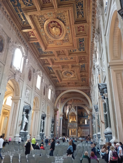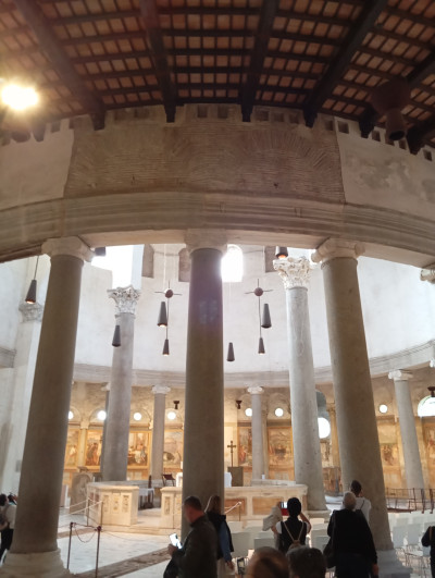 3. nap: Vasárnap – bepillantva a közeli S. Maria in Domenica templomba is - a Santo Stefano Rotondo várt minket, ahol több magyar csoporttal együtt vettünk részt az ünnepi szentmisén, a magyarok római nemzeti templomában. Vagy 20 magyar pap koncelebrált, körben a vértanúk falra festett ’hittankönyve’, bennünk pedig valami különleges öröm, hogy Róma Szent István királyunk óta a magyar zarándokok igazi otthona. Innen a lateráni Szent János bazilikához mentünk. Itt először a Szent Lépcsőn imádkozhattunk, ’a legszentebb helyen’, majd a pápa címtemploma, minden templom anyja, mestere és feje fogadott be minket Szent Kapuján át.