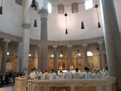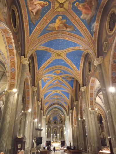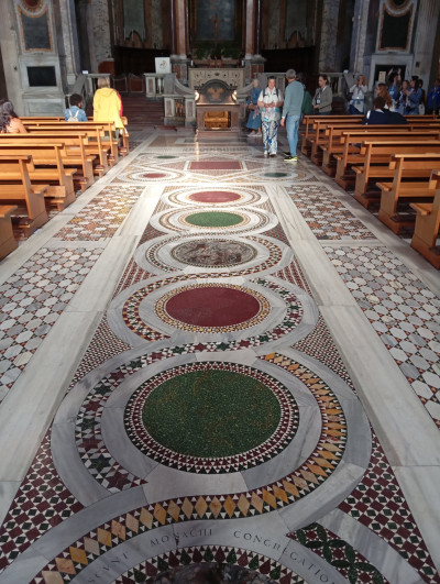 Erre a napra az ebéd után még egy pápai bazilika várt ránk: a Falakon kívüli (fuori la mura) Szent Pál bazilika. A nagyhatású Pál-szobor fogadott minket az előkertben, majd itt is énekelve léptük át a Porta Sancta küszöbét. Körbe a pápák képei és Szent Pál vértanúságának emlékei fogadnak minket. Lenyűgöző méltóság és imádságra indító béke a csodálatos mozaikok és az 1823-as tűzvészt megelőző időkből... Innen már szállásunkra buszoztunk vissza, másnap korai indulás és Assisi vár ránk!