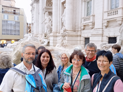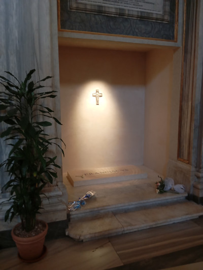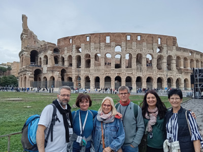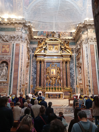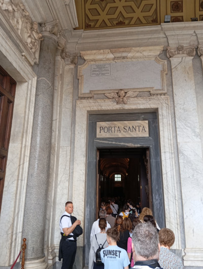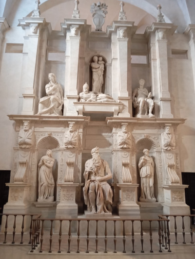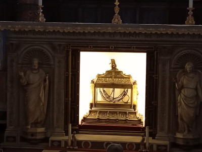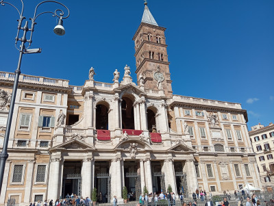 4. nap: Hétfőn a Santa Maria Maggiore, azaz a Havas Boldogasszony bazilika volt a fő cél. Előtte szentmisén vettünk részt az ősi Santa Prassede bazilikában, majd a végeláthatatlan sorunkat kivárva bejuthattunk az egyház legnagyobb Mária-templomába, ahol Ferenc pápa nyugszik egyszerű sírjában. Miután a Szent Kapun beléptünk, bejártuk a templomot, és elmondtuk imáinkat Mária mint a Salus Populi Romani ősi képe előtt. Szabadidőnk végezével együtt másztunk fel a Monte Oppion álló Basilica di San Pietro in Vincolihoz, azaz a Bilincses vagy Vasas Szent Péter templomhoz. Itt az imádságokat követően II. Gyula pápa fényben ragyogó síremlékének szobrait, köztük a világhíres Mózes szobrot csodálhattuk meg.