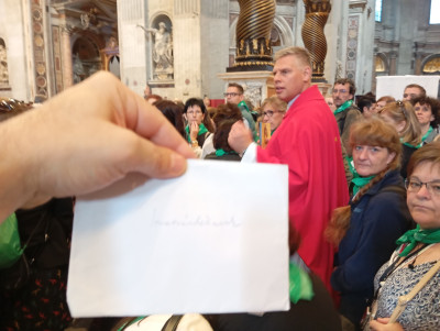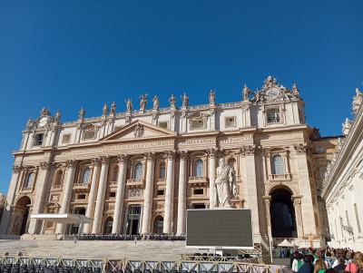 5. nap: Kedden reggeli nélkül, hideg csomaggal indultunk, hogy időben bejussunk a vatikáni Szent Péter Bazilikába. Csoportunk az Angyalvár tövében kapta meg a zarándokkeresztet, amit követve a Kiengesztelődés (avagy Kiegyezés) útján jutottunk el imádkozva, énekelve a csodálatos Szent Péter térre. A gyors biztonsági vizsgálat után alig kellett várnunk, hogy a Szent Kapun át bejussunk a világ legnagyobb és, bátran mondhatjuk, legszebb templomába. Az apostolfejedelem sírjánál Mórocz atya vezetésével imádkoztunk, hiszen énekelni nem lehetett, majd kivárva a beosztásunkat a Katedra-oltárhoz mehettünk, hogy több magyar zarándokkal együtt - a lezárt Magyarok Nagyasszonya magyar kápolna helyett - a hatalmas templom kiemelt helyén vegyünk részt szentmisén. Felemelő érzés volt ott énekelni a pápai és a magyar Himnuszt! A mise után újra bejártuk a befogadhatatlan szépségű helyet: ismét megnéztük a Pieta szobrát, majd Szent II. János Pál pápa sírnál imádkozhattunk.