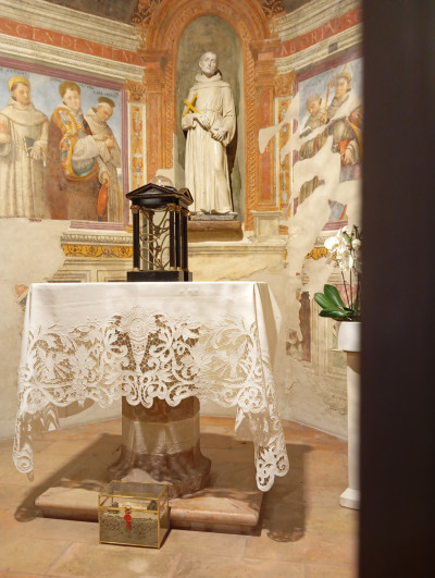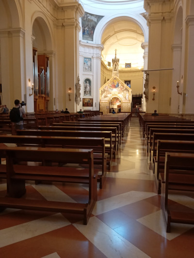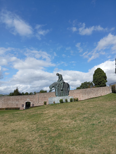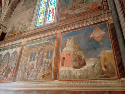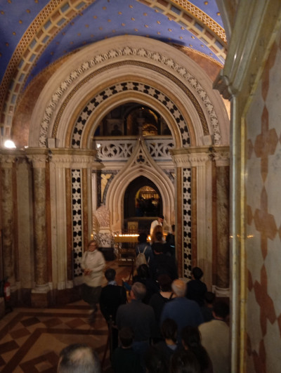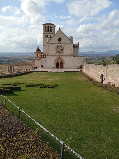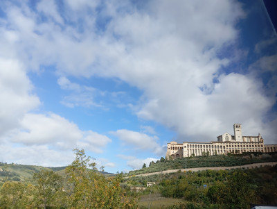 6. nap: Szerdán korai bepakolással és gyors reggelivel utaztunk Assisi felé. A kellemes időjárás és a békés umbriai táj készített fel minket Szent Ferenc üzenetére. A parkolóból felsétálva először a Ferencet megszólító kereszt és Szent Klárának sírja előtt imádkoztunk a róla elnevezett bazilikában. Az óvárosban tett séta során felkerestük a nemrég boldoggá avatott Carlo Acutis sírját, Ferenc szülőházát, születésének helyét, majd megcsodálva a Sacro Convento Cimabue festette alsó és Giotto festette felső szintjét, az altemplomban, ahol az első négy társa és barátja, Jacoba Sottesoli is nyugszik, Szent Ferenc sírjánál imádkozhattunk. 'Salve, Sancte Pater, patriae lux, forma minorum!' Zarándoklatunk záró-hálaadó szentmiséjét a kolostor kápolnájában tartottuk, Mórocz Tamás atya ferences diákként Szent Ferenc karaktert adó sebeiről beszélve egy ferences diák versét idézte.